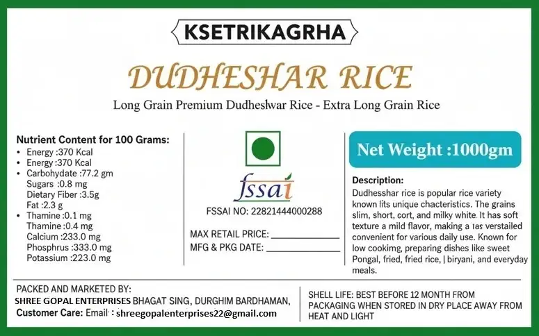 Dudheshwar Rice is a natural source of carbohydrates, which provide essential energy for daily activities. It is light on the stomach and easy to digest, making it suitable for all age groups including children and elderly people.