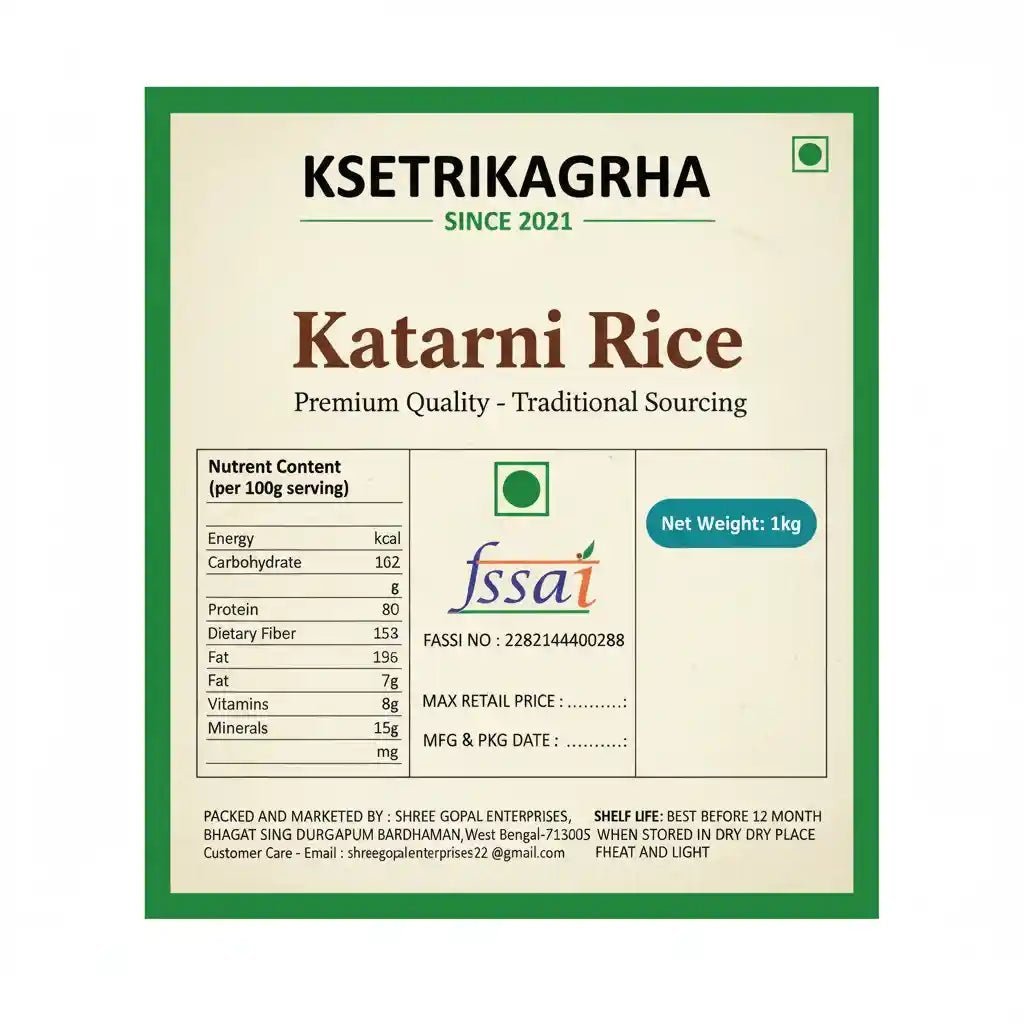 Note: Rinse gently before cooking. Soaking for 20-30 minutes recommended. Use 1:1.75 rice to water ratio. Cooking time: 15-18 minutes. Store in airtight container to preserve unique aroma. Authentic GI-tagged Katarni rice from Bihar – a rare culinary treasure.