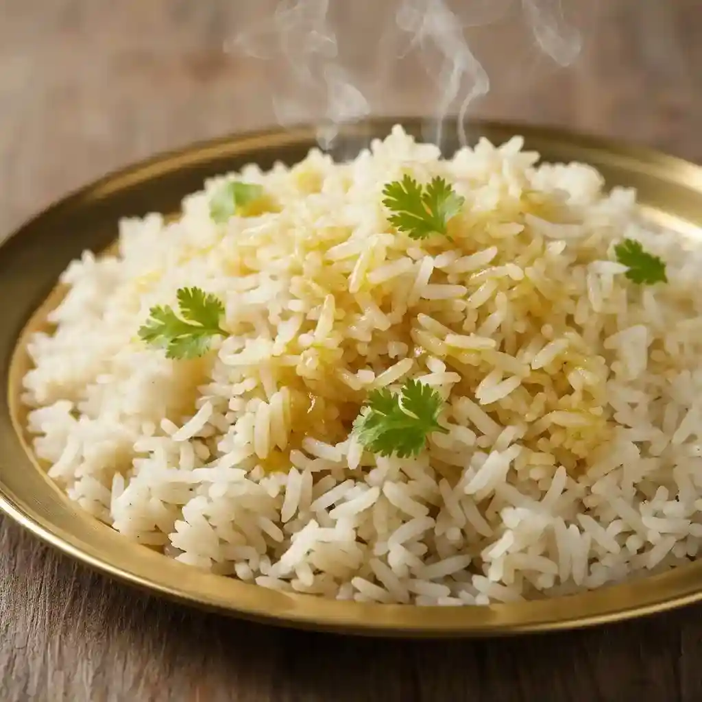 Rice Cooker: Add rinsed rice and water in 1:1.5 ratio, add pinch of salt, close lid and press cook, rest 5 minutes after cooking, fluff and serve.